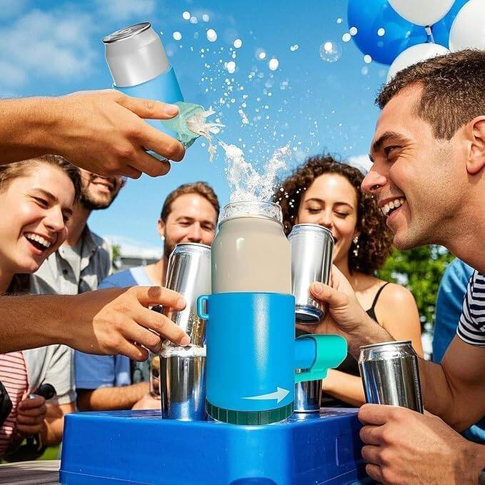 Players rotate the base and pass the can, each adding a drink. The tension rises with each turn until the can explodes for a thrilling twist.